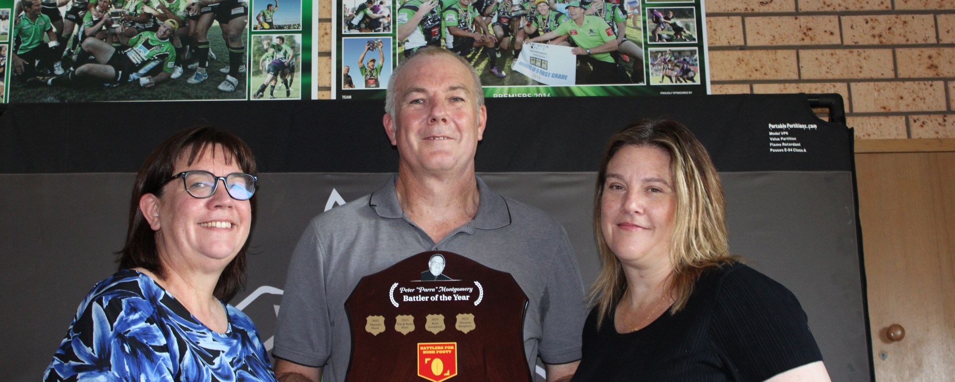The Peter “Parra” Montgomery Shield, to be awarded to each season’s Battler of the Year by Battlers For Bush Footy, was unveiled to Mr Montgomery’s three children, Janine, Michael and Sharni, along with members of the Albury Thunder club at Greenfield Park on Wednesday evening.